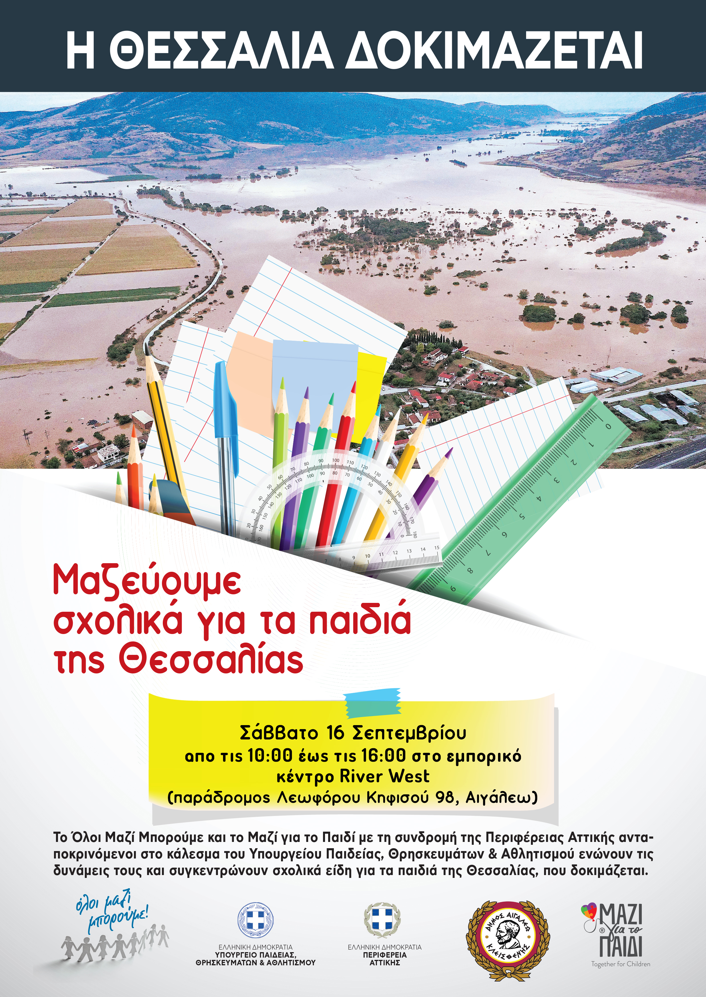 Ο Δήμος Αιγάλεω, το «ΟΛΟΙ ΜΑΖΙ ΜΠΟΡΟΥΜΕ» και το «Μαζί για το Παιδί», με τη συνδρομή της Περιφέρειας Αττικής, ανταποκρινόμενοι στο κάλεσμα του Υπουργείου Παιδείας, Θρησκευμάτων & Αθλητισμού ενώνουν τις δυνάμεις τους και συγκεντρώνουν σχολικά είδη για τα παιδιά των περιοχών της Θεσσαλίας, που επλήγησαν από την καταιγίδα Daniel.