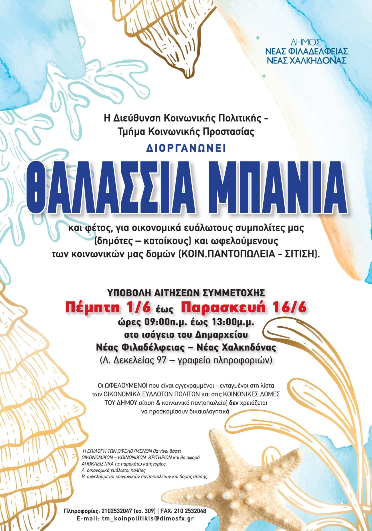 Πληροφορίες: Τμήμα Κοινωνικής Προστασίας, Διεύθυνση Κοινωνικής Πολιτικής Δήμου Νέας Φιλαδέλφειας – Νέας Χαλκηδόνας (Αχαρνών 464 & Αγ. Αναργύρων | Τ.Κ. 14343| Νέα Χαλκηδόνα). Τηλ: 210 2532047 εσ. 309 | E-mail: [email protected]