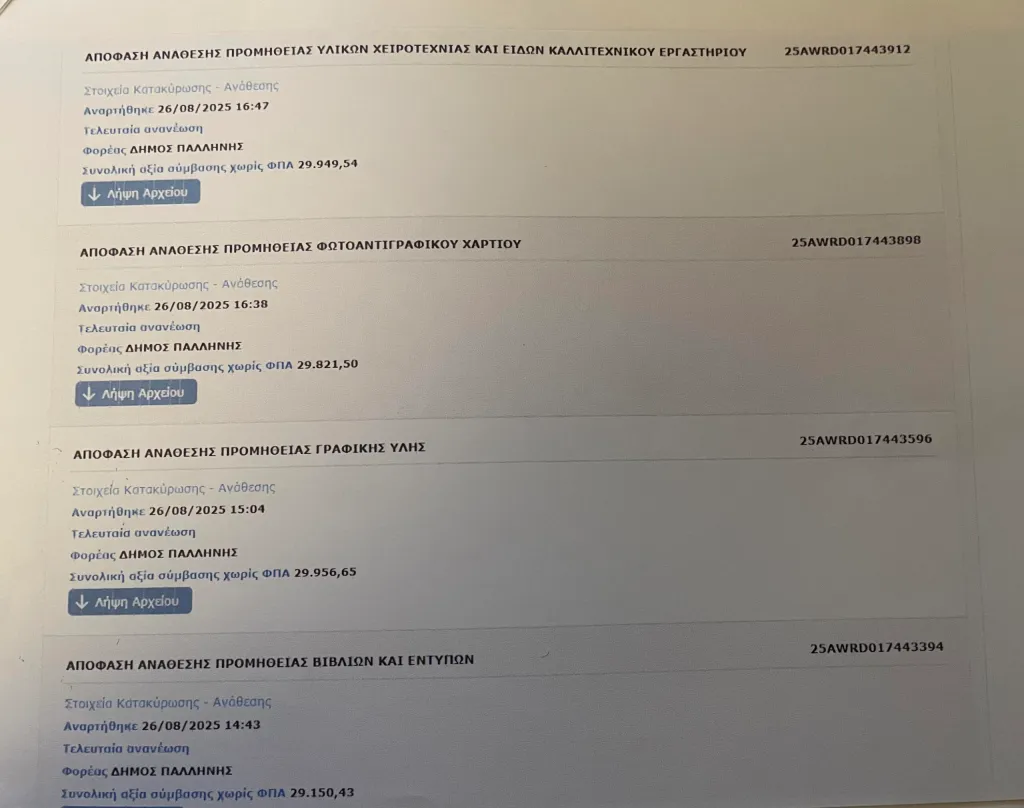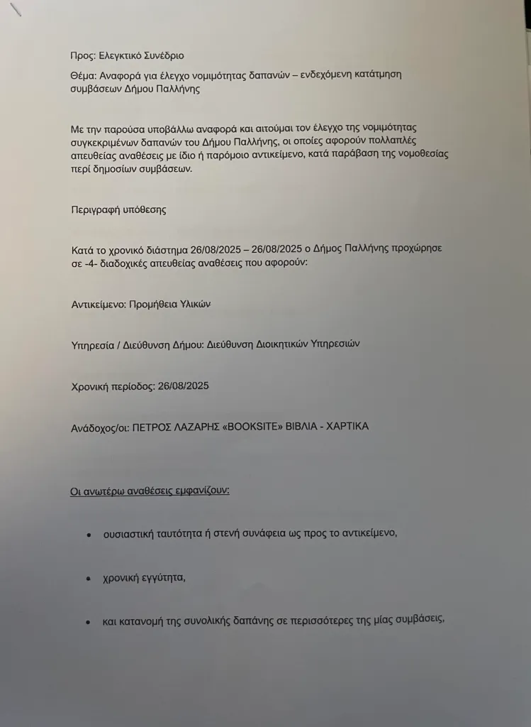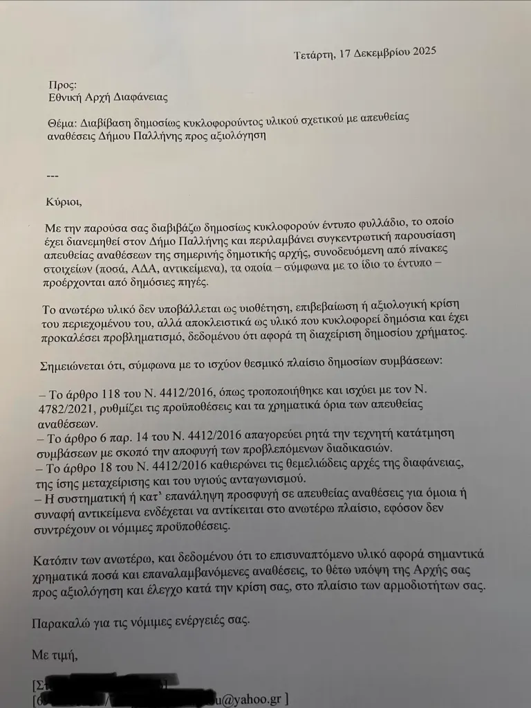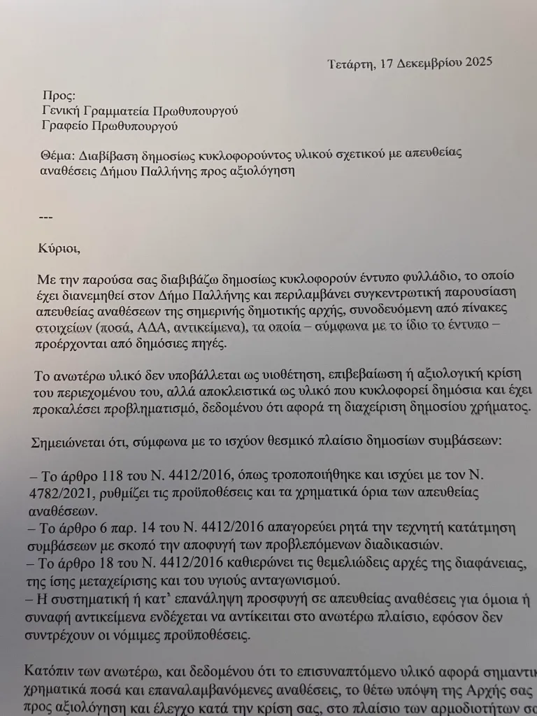 Τι αναφέρει η αντιπολίτευση του δήμου Παλλήνης για τις αλλεπάλληλες απευθείας αναθέσεις χωρίς διαγωνισμό από τον Χρήστο Αηδόνη
