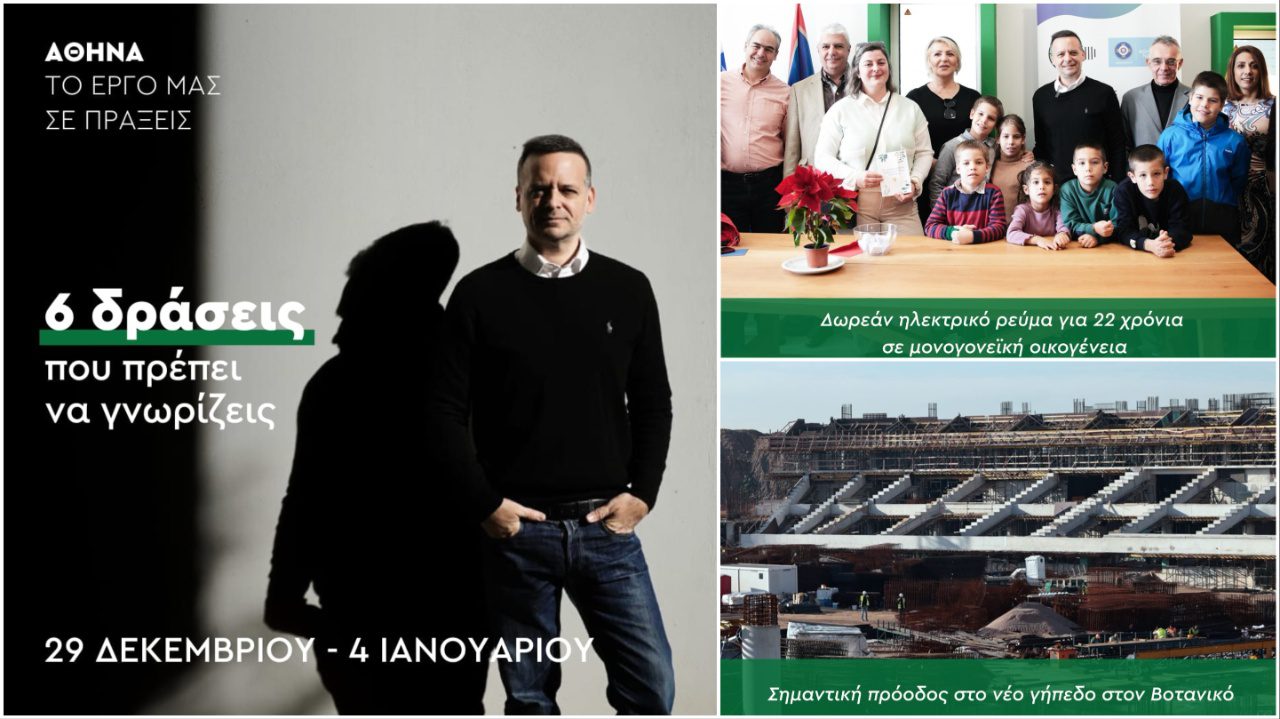 Στις σημαντικότερες δράσεις του Δήμου Αθηναίων την περίοδο από τις 29 Δεκεμβρίου έως τις 4 Ιανουαρίου αναφέρεται σε ανάρτησή του ο δήμαρχος Αθηναίων Χάρης Δούκας, παρουσιάζοντας έξι παρεμβάσεις που, όπως σημειώνει, αποτυπώνουν το όραμα της δημοτικής αρχής για μια πόλη πιο ανθρώπινη, σύγχρονη και κοινωνικά δίκαιη.