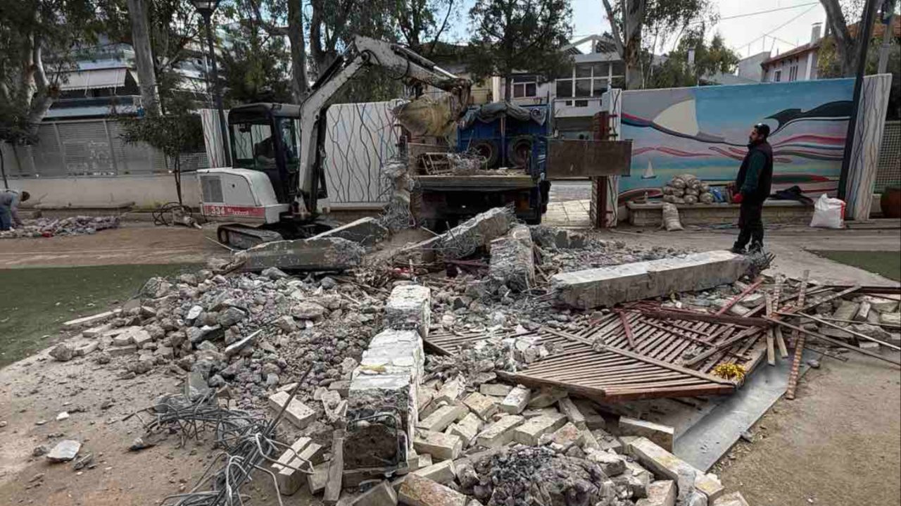 Στο πλαίσιο της παρέμβασης, απομακρύνθηκε από τον χώρο του σχολείου η παλιά κατασκευή – «πέργκολα» από μπετόν, η οποία επί χρόνια παρέμενε στον αύλειο χώρο.