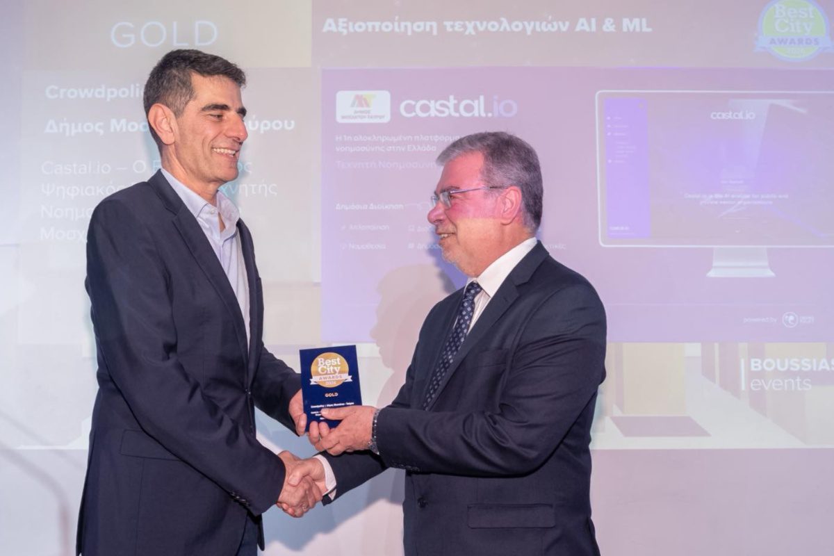 Ο Δήμος Μοσχάτου–Ταύρου τιμήθηκε με GOLD Βραβείο στα Best City Awards, στην κατηγορία ΤΠΕ & Διακυβέρνηση – Αξιοποίηση τεχνολογιών Τεχνητής Νοημοσύνης (AI) και Μηχανικής Μάθησης (ML), για τον καινοτόμο ψηφιακό βοηθό Castal.io.