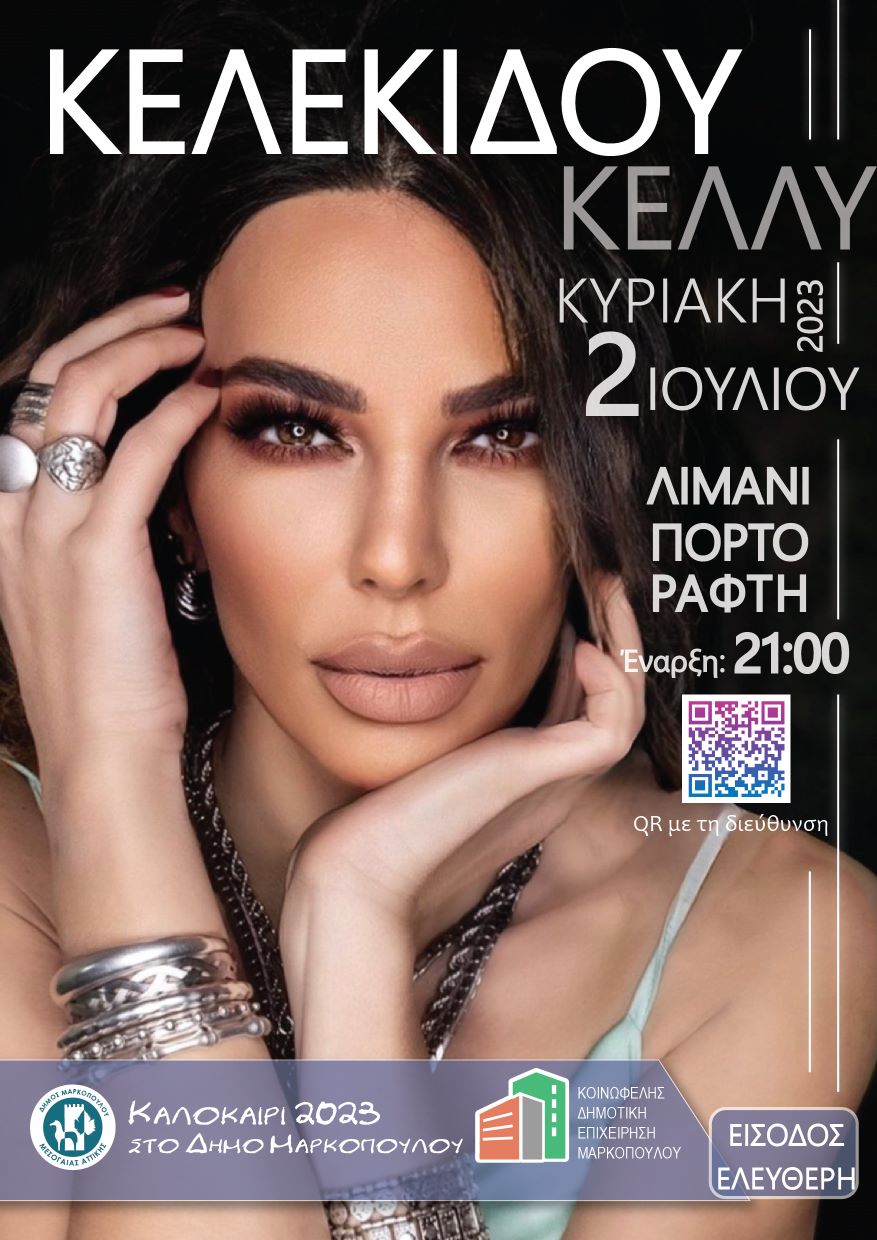 Ο Δήμος Μαρκοπούλου και η Κοινωφελής Δημοτική Επιχείρηση Μαρκοπούλου, σας προσκαλούν την Κυριακή 2 Ιουλίου 2023 και ώρα 21.00 στο Λιμάνι Πόρτο Ράφτη, δίπλα στο άγαλμα του «αφανούς ναύτη» , να διασκεδάσουμε όλοι μαζί με την Κέλλυ Κελεκίδου.