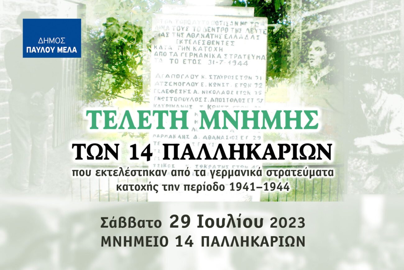 Ο Δήμαρχος Παύλου Μελά, Δημήτρης Δεμουρτζίδης, ο Αντιδήμαρχος Πολιτισμού – Αθλητισμού, Παντελής Νιγδέλης και το Δημοτικό Συμβούλιο, σας προσκαλούν στην καθιερωμένη ετήσια Τελετή Μνήμης των 14 Παλληκαριών που εκτελέστηκαν στην Ευκαρπία από τα γερμανικά στρατεύματα κατοχής και τους συνεργάτες τους.