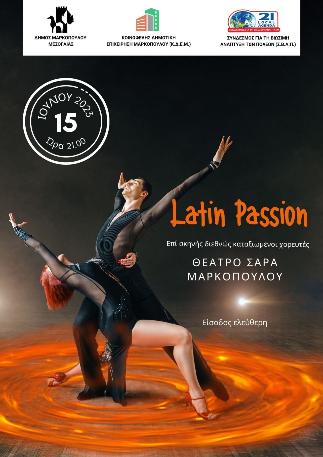 Ο Δήμος Μαρκοπούλου, η Κοινωφελής Δημοτική Επιχείρηση Μαρκοπούλου (Κ.Δ.Ε.Μ.) και ο Σύνδεσμος για την Βιώσιμη Ανάπτυξη των Πόλεων (Σ.Β.Α.Π.), διοργανώνουν την χορευτική παράσταση «Latin Passion», το Σάββατο 15 Ιουλίου 2023 και ώρα 21.00 στο Ανοικτό Θέατρο Σάρα Μαρκοπούλου .