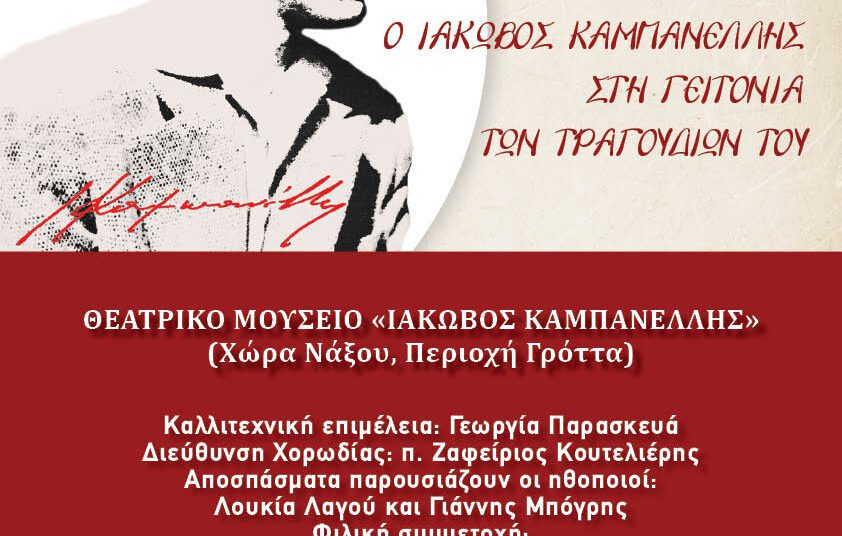 ΠΟΛΙΤΙΣΜΟΣ|24/07/2023 · 10:13 Post Views: 2.149 Δήμος Νάξου και Μικρών Κυκλάδων: Ο Ιάκωβος Καμπανέλλης στη γειτονιά των τραγουδιών του